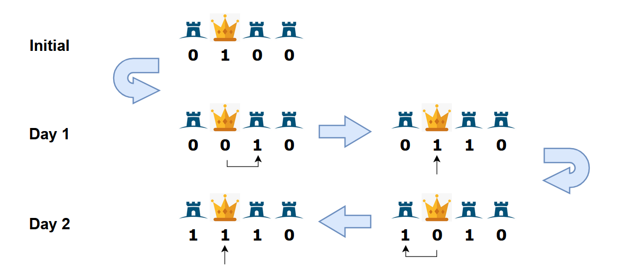 - 第一天,命令第 3 号基地的 0 个士兵移动到第 2 号基地。一天结束时,一名新士兵加入第 2 号基地(此时第 2 号基地有 2 名士兵,其它基地为 0)。