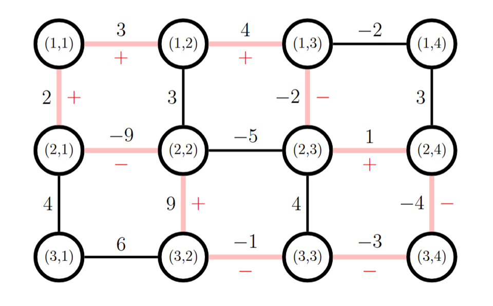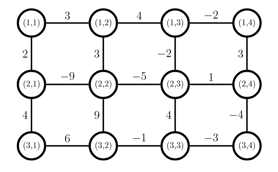 仅存在(且只存在)如下两种街道:$ (i,j) $ 与 $ (i+1,j) $ 之间有街道,或 $ (i,j) $ 与 $ (i,j+1) $ 之间有街道。$ (i, j) $ 与 $ (i + 1, j) $ 之间的街道权值为 wi,j,$ (i, j) $ 与 $ (i, j + 1) $ 之间的街道权值为 vi,j。