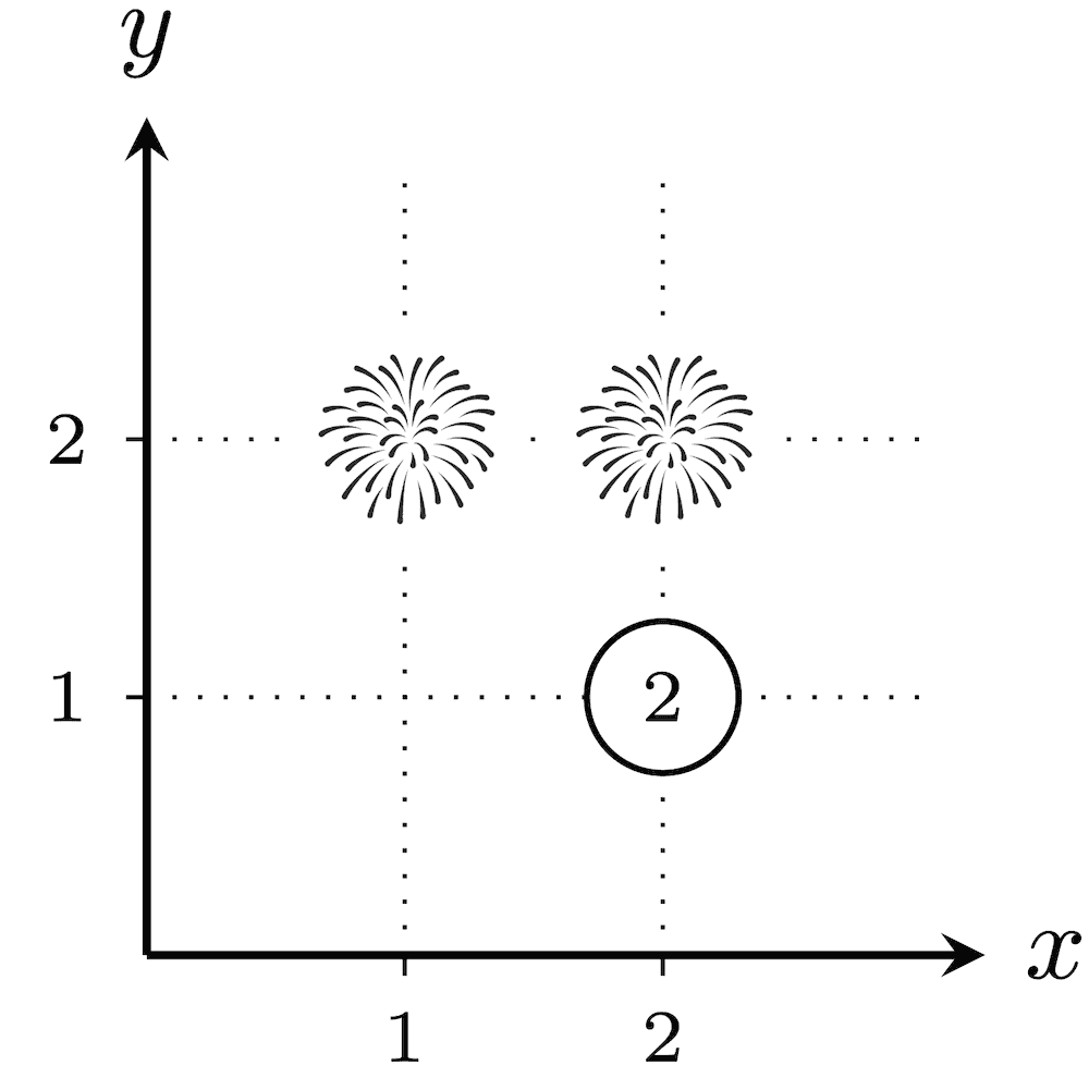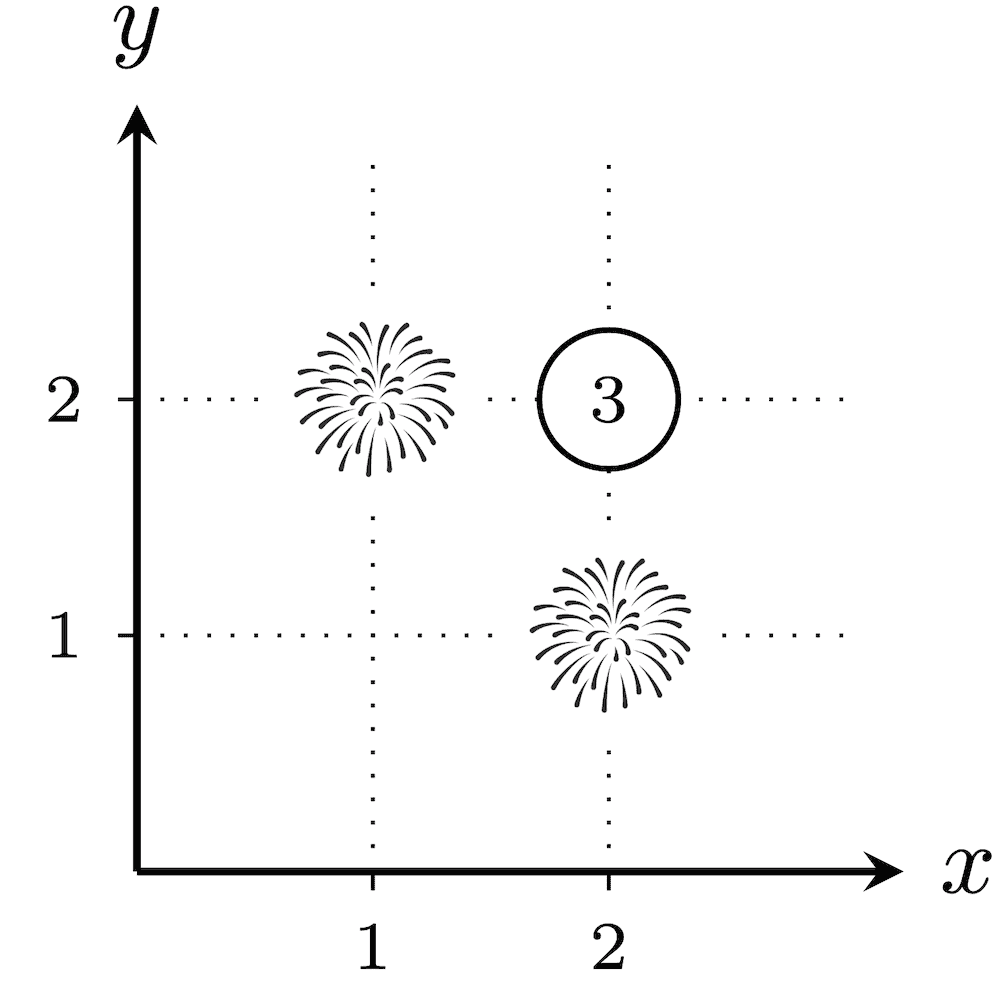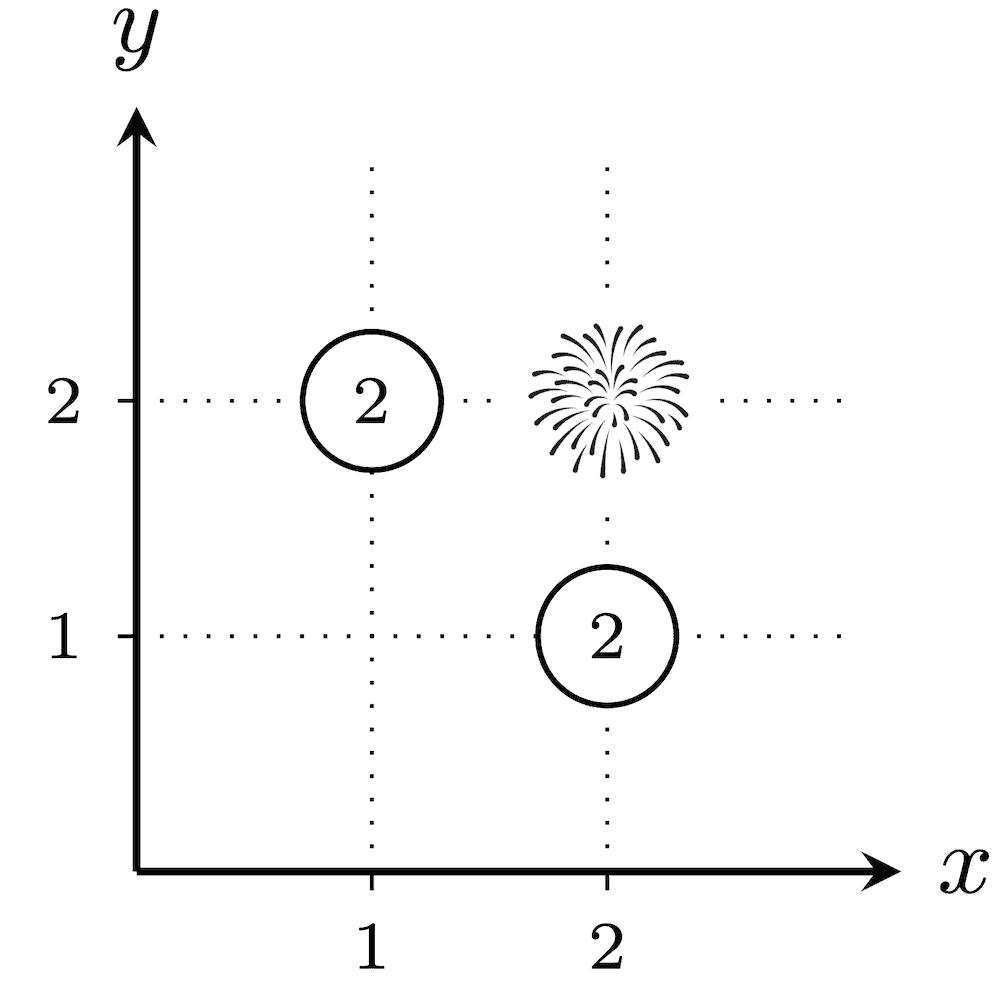 在第二个测试用例里,共有 22−1=3 种烟花发射方式。任意一种方案,从 (1,1) 到 (100,100) 的欧几里得距离为 (100−1)2+(100−1)2=19602=20000,不存在距离恰好为 k 的城市,所以每个没放烟花的城市都会被分配数值 1。因此,每种真子集 T 的爆炸性均为 1,所以答案为 1+1+1=3。