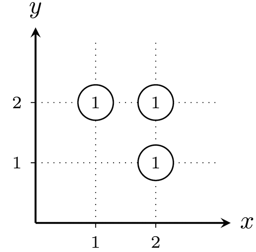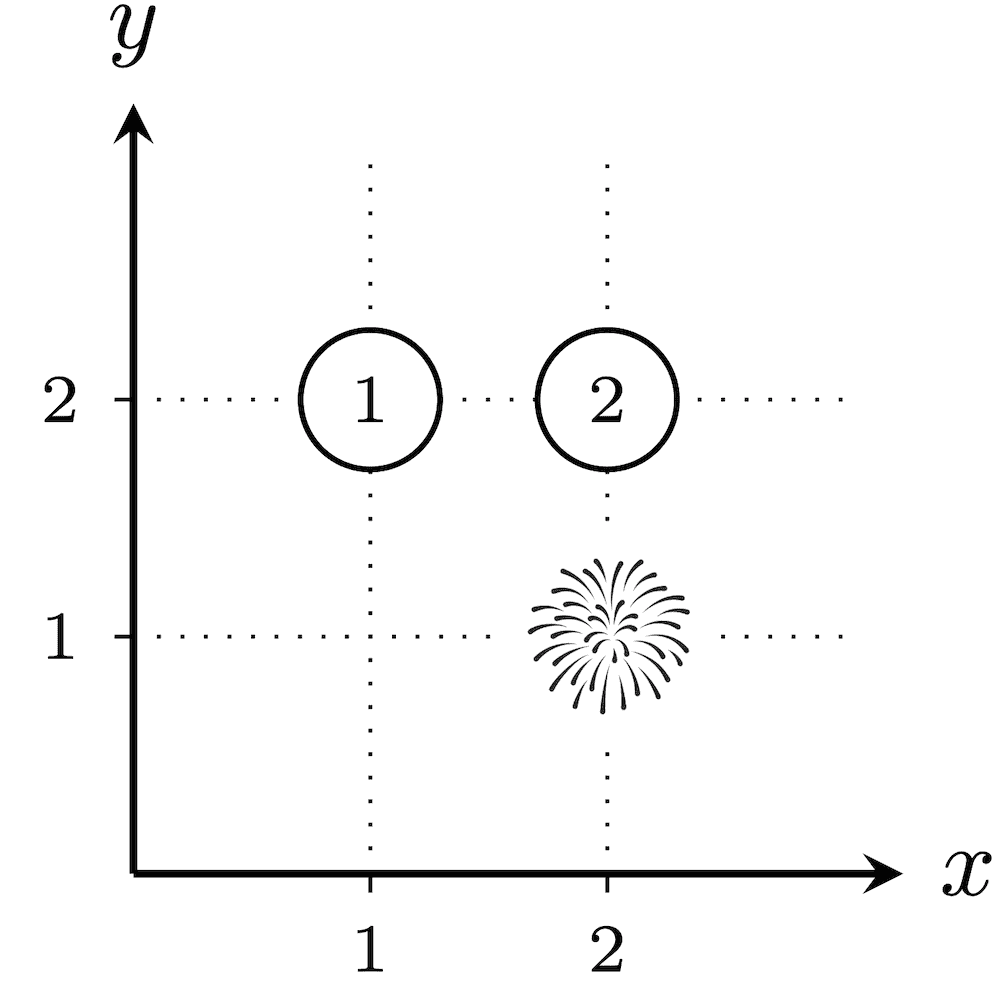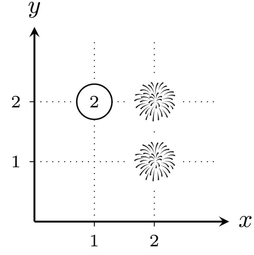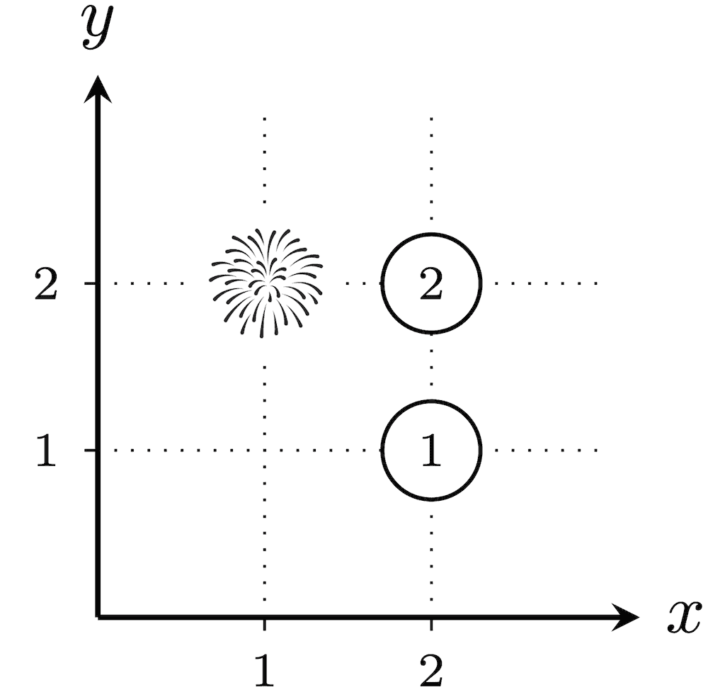在第二个测试用例里,共有 22−1=3 种烟花发射方式。任意一种方案,从 (1,1) 到 (100,100) 的欧几里得距离为 (100−1)2+(100−1)2=19602=20000,不存在距离恰好为 k 的城市,所以每个没放烟花的城市都会被分配数值 1。因此,每种真子集 T 的爆炸性均为 1,所以答案为 1+1+1=3。