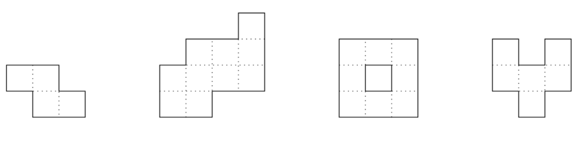 请判断是否可以将给定的凸多连方划分为两个不相交且连通的多连方,并且这两个多连方全等。下图展示了题目描述中前两个凸多连方的合法划分示例: