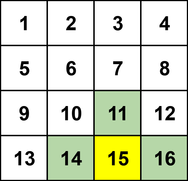 上图为 n=4 的网格以及对应的最优解。其中黄色格子的代价最大,绿色格子为其相邻格子。该格子的代价为 15+11+14+16=56。