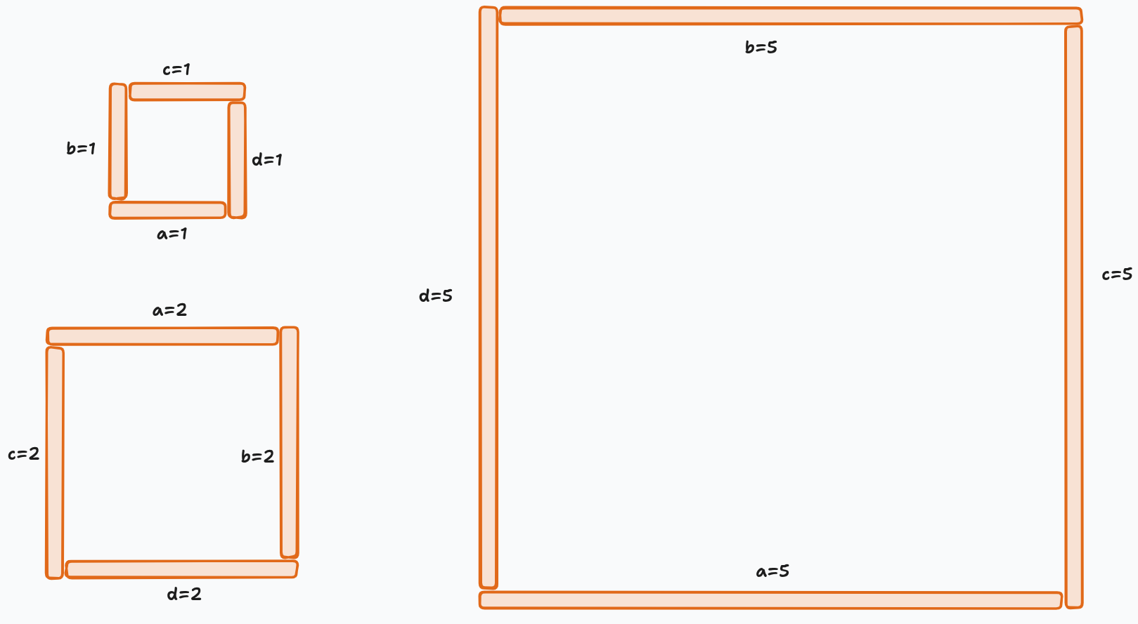 在第二个、第三个和第六个测试用例中,可以像下图这样拼成一个正方形: