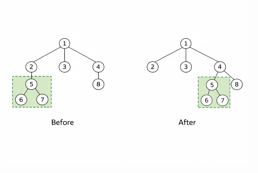 - 任选一个节点 u(u=r)。删除节点 u 与其父节点之间的边 ∗。然后,将 u 与仍然能从 r 到达的任意节点 v 相连。可以证明,执行该操作后,图依然保持为树。