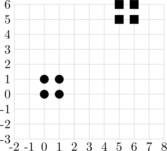 接下来的 n 行,每行包含两个整数 xi 和 yi(∣xi∣,∣yi∣≤109),表示第 i 个泵站的坐标。所有泵站的位置各不相同。
