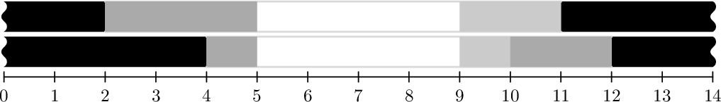 下图显示了第一个样例的解法。墙体用黑色填充,门用不同深浅的灰色填充,开口部分为白色。当每层上的第一扇门全部靠左,剩下的门靠右移动时,可以获得宽度为 4 的最大开口。