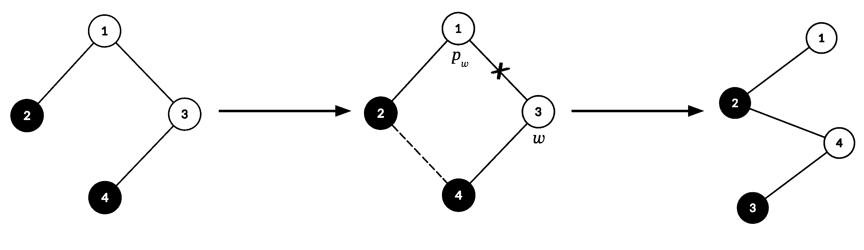 - 然后,移除连接 pw 和 w 的边,并在任意两顶点间添加一条边,前提是 T 依然是一棵树。