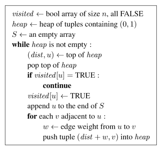 你的弟弟实现了 Dijkstra 算法,以查找从顶点 1 到所有其他顶点的最短距离。伪代码如下。数组 S 记录了每个顶点首次从堆中弹出的顺序。注意,虽然同一个顶点的元组可能被多次压入堆,但每个顶点恰好只会被加入 S 一次。