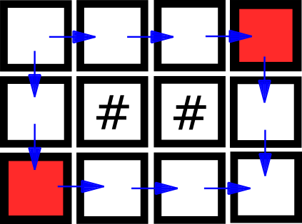 The following picture illustrates the island in the third example. Blue arrows show possible paths Vasya may use to go from (1,1) to (n,m) . Red illustrates one possible set of cells for the Witch to turn into impassable forest to make Vasya's trip from (1,1) to (n,m) impossible.