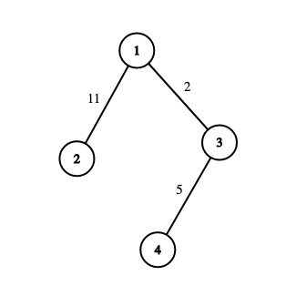 Consider the graph below. It is a prime tree as the weight of every path of two or less edges is prime. For example, the following path of two edges: 2→1→3 has a weight of 11+2=13 , which is prime. Similarly, the path of one edge: 4→3 has a weight of 5 , which is also prime.