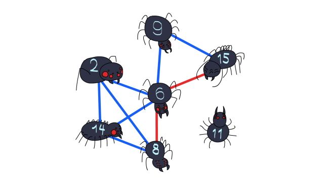 假设一只拥有八条腿的蜘蛛想要向一只拥有 15 条腿的蜘蛛发送消息。它不能直接发送,因为 gcd(8,15)=1。但它可以通过一只拥有六条腿的蜘蛛传递消息,因为 gcd(8,6)=2 且 gcd(6,15)=3。因此,消息将在两秒内到达。