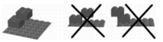 左:将积木放在另一个积木的顶部上的一种可行的方式。中:一种非法的方式(上层积木挂在空中)。右:另一种非法方式(上方的积木延伸到底板外)。