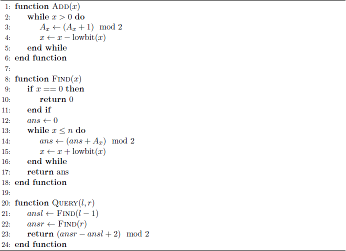 其中 lowbit(x) 表示数字 x 最低的非 0 二进制位,例如 lowbit(5)=1,lowbit(12)=4。进行第一类操作的时候就调用 Add(x),第二类操作的时候答案就是 Query(l,r)。