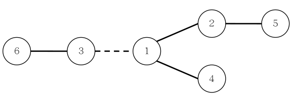 每条道路的修建都要付出一定的费用,这个费用等于道路长度乘以道路两端的国家个数之差的绝对值。例如,在下图中,虚线所示道路两端分别有 2 个、4 个国家,如果该道路长度为 1,则费用为 1×∣2–4∣=2。图中圆圈里的数字表示国家的编号。
