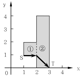 题目保证:xi,1<xi,2=xi+1,1,且 yi,1<yi,2,相邻两个矩形一定有重叠在一起的边(如图中虚线所示),智能车可以通过这部分穿梭于矩形区域之间。
