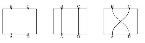 例如,考虑下图左侧所示的电路板。只需要一层电路板就可以连接 A 与 B 以及 D 与 C,方案如中间所示。但是连接 A 与 C 以及 D 与 B 就不能用一层电路板完成,如右图所示。