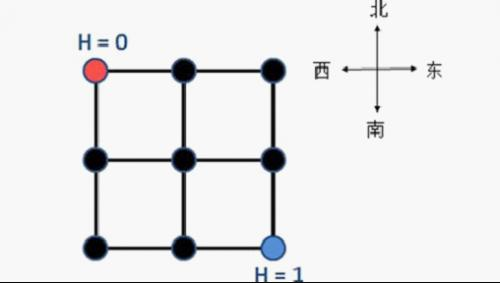 小 Z 还测量得到这个城市西北角的交叉路口海拔为 0,东南角的交叉路口海拔为 1(如上图所示),但其它交叉路口的海拔高度都无法得知。小 Z 想知道在最理想的情况下(即你可以任意假设其他路口的海拔高度),每天上班高峰期间所有人爬坡消耗的总体力和的最小值。