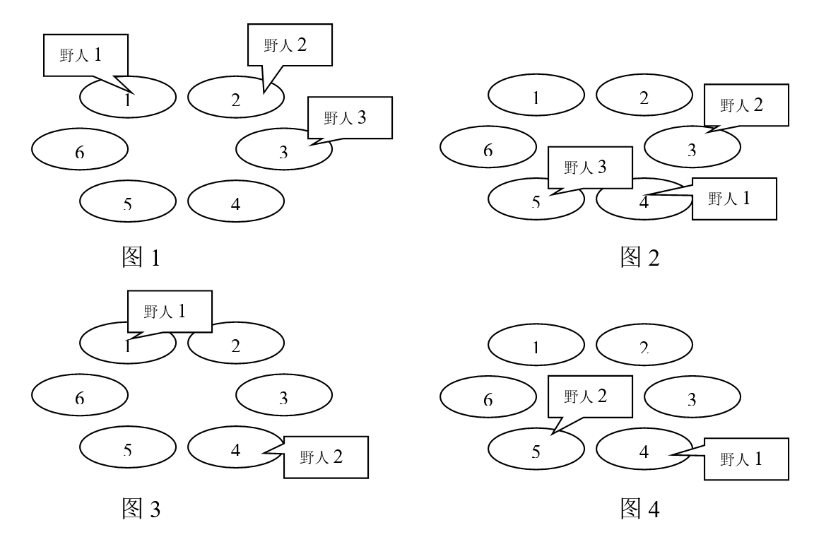 下面四幅图描述了一个有 6 个山洞,住有三个野人的岛上前四年的情况。三个野人初始的洞穴编号依次为 1,2,3;每年要走过的洞穴数依次为 3,7,2;寿命值依次为 4,3,1。