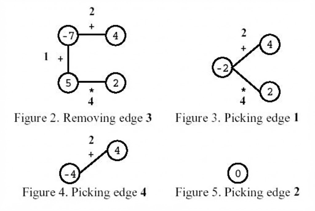 如图所示,玩家先移除编号为 3 的边。之后,玩家选择计算编号为 1 的边,然后计算编号为 4 的边,最后,计算编号为 2 的边。结果是 0。